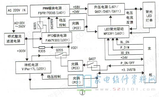 TCL PE461C4型二合一板的电路框图如图1所示,主要由输入整流滤波电路、开/待机控制电路(待机电源控制芯片VIPer17L)、功率因数校正(PFC)电路(控制芯片FAN7930C)、PWM电路(即主电源,控制芯片FSFR1700XS)、背光 LED驱动电路(控制芯片MP3391)、反馈及保护等电路组成,输出3.3VSTB/0.2A、24V/1.25A、58V/1.9A电压,广泛用于42英寸及以上具有3D功能的大屏幕LED彩电中。