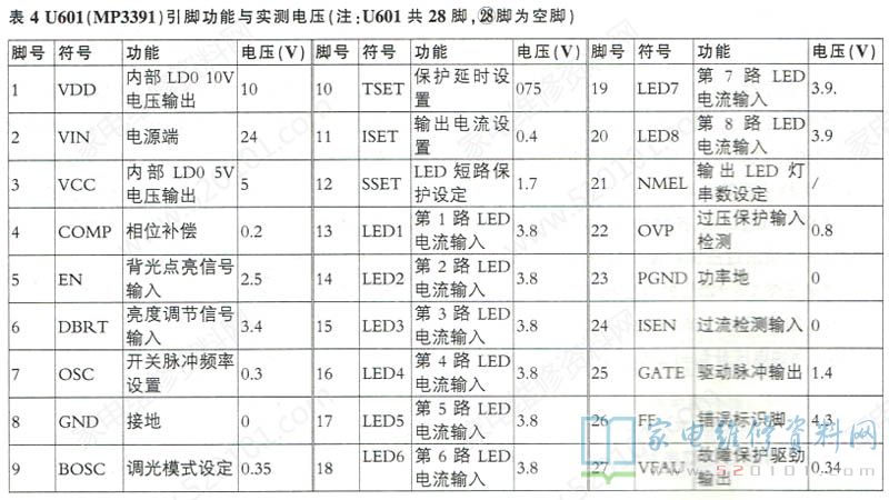 故障现象4:背光灯不亮。分析检修:先测插座P601②、③脚电压是否大于+2V,若否,则对主板输出的背光开/关、亮度调节信号及传输电路进行检查。若正常,则检查+58V、+24V供电是否正常;若不正常,则对电压的产生及控制电路进行排查。若供电正常,则测量升压输出端电压是否为105V/115V(2D/3D状态时),如果异常,则检查Q601、R620、D601 .C611.C612、L601等元件,最后代换U601、U602。MP3391 引脚功能与在路2D状态下实测电压见表4,供参考。