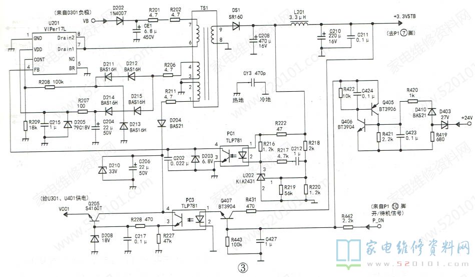 当+3.3VSTB电压因负载短路而过流时,经D211、D212、R208加至U201③脚的脉冲电压低于+1.26V,IC内部过流保护电路动作,待机电源及PFC、PWM电路均停止工作,电源无输出。与此同时,TS1③-④绕组产生的感应电压也会大幅下降,当U201②脚(电源端)电压低于+7.5V时,IC内部振荡器停止工作,整个电源无输出。