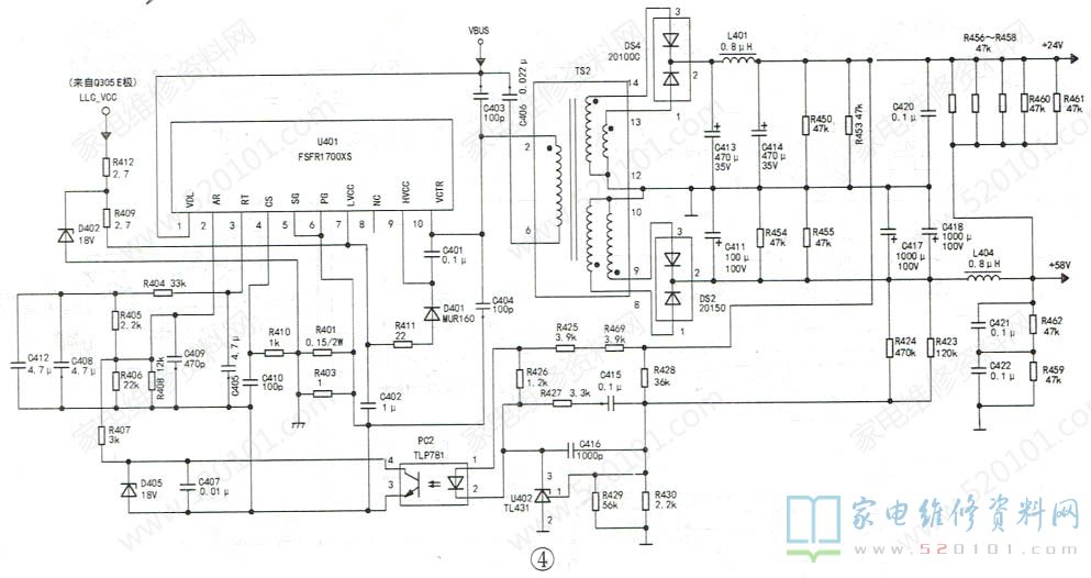 图4中,PFC电路送来的VBUS电压一路直接加至U401( FSFR1700XS )的①脚,为内部高端开关管供电,另一路送往谐振电容C406。此时经Q305送来的LLC_VCC电压(约为+17V)通过R412、R409加至U401电源端⑦脚,U401内部的锯齿波发生器、脉宽调制器工作,产生的开关激励脉冲使内部半桥功率开关管导通,开关变压器TS2初级②-⑥绕组与谐振电容C406串联谐振。C401、D401、R411及U401内部电路构成的自举升压电路工作为低端开关管提供HVCC高压电源。TS2次级12-13、12-14绕组产生的感应电压经DS4全波整流及L401、C413、C414、C420滤波后,得到+24V电压;①-⑧、10-⑨绕组产生的感应电压经DS2全波整流及C411、C417、C418、L404、C421、C422滤波后,得到+58V电压。