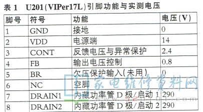 故障现象1:无+3.3VSTB待机电压输出。分析检修:无+3.3V待机电压输出首先应检查u201⑧脚电源启动端是否有约+290V电压;如果无,检查市电的输入、整流滤波电路;若有,则断开L201右端试机。检测C208正极是否有待机电压输出,若有输出,表明负载有短路故障;若仍无输出,表明故障在电源本身,这时可断开U201④脚外接电路试机。若有很高的电压输出,说明故障在稳压控制环路;否则,故障在u201②、③脚外接的整流滤波电路或U201本身。表1是U201的引脚功能与待机电压。