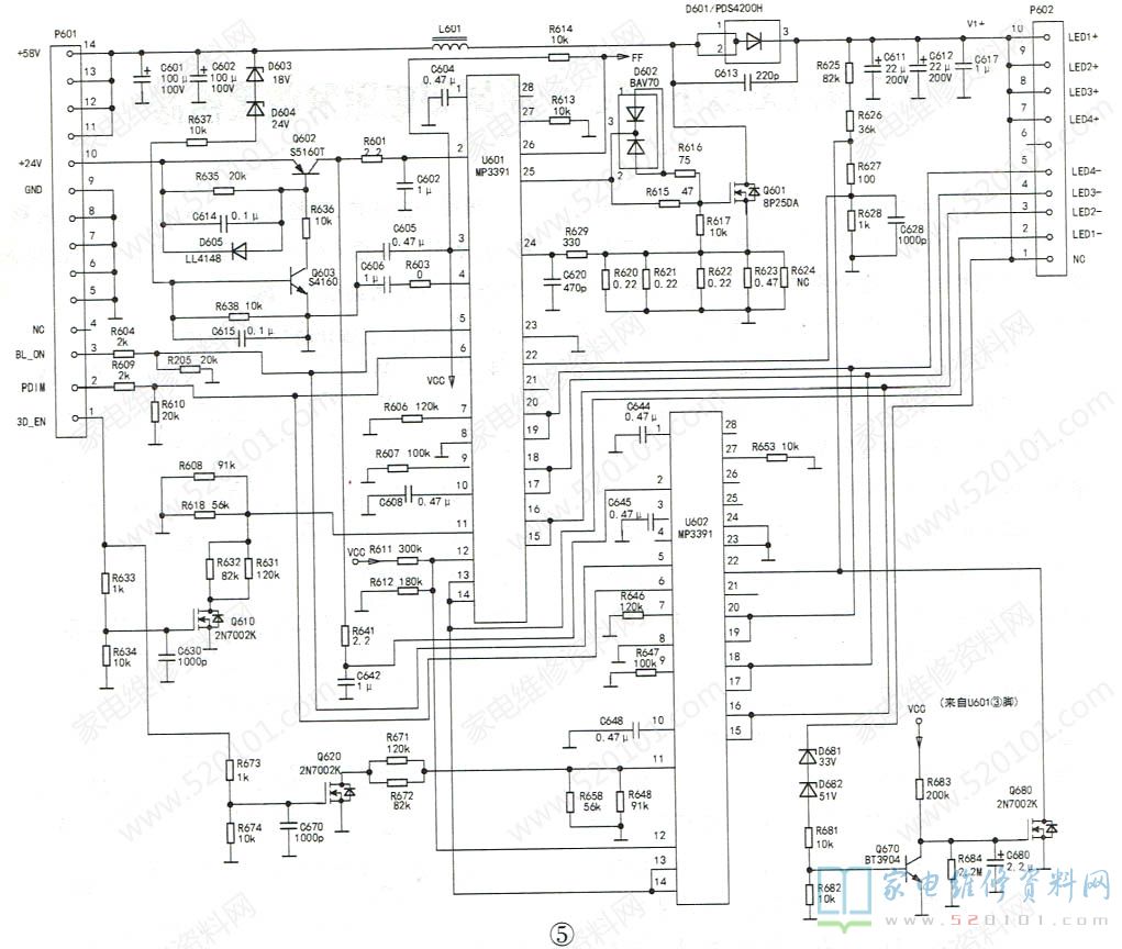 在主电源工作后,输出的+24V、+58V电压分别加至LED驱动电路插座P601的10脚及11~14脚,如图5所示。