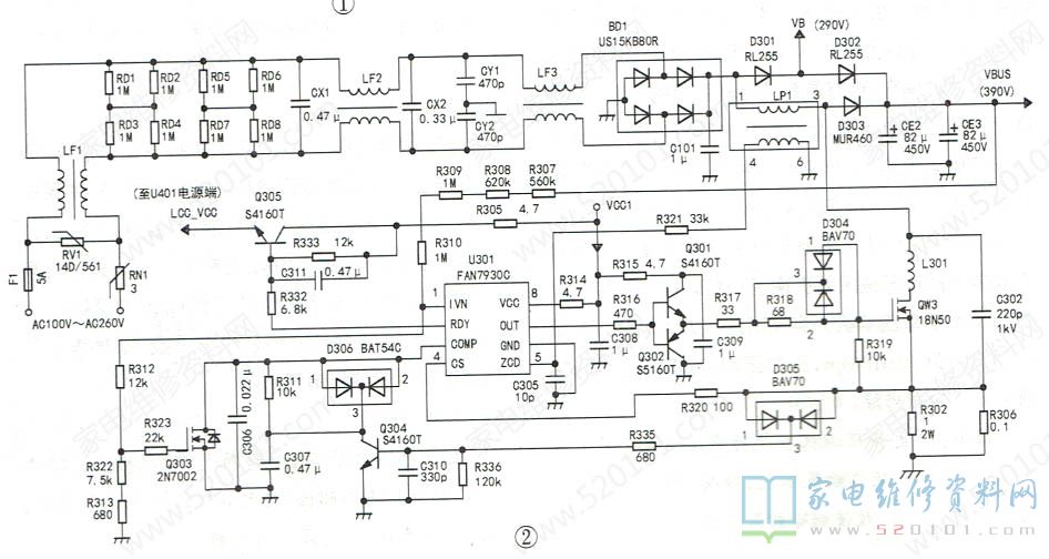 市电经保险管F1、热敏电阻RN1、抗高压压敏电阻RV1进入抗干扰滤波电路,如图2所示。RD1~RD8、LF1、LF2、LF3、CX1、CX2、CY1、CY2等构成EMC电路,以消除电网中的杂波,同时避免开关电源对电网产生干扰。滤除干扰后的市电经全桥BD1整流、C101滤波后输出约+300V的脉动直流电压,一路经变压器LP1初级①-③绕组及电感L301送至PFC功率管Qw3的D极,第二路经D301、D302续流后送入PFC电路输出端(即滤波电容CE2、CE3正极),D301与D302的连接处的VB电压送往待机电源。