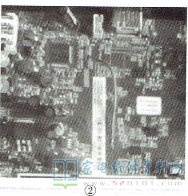 从实测数据看U601(TAS5706 )25脚电压波动明显,且与正常值相差较大。关机,测4只电阻对地电阻(数字表红笔接地,黑表笔测量),发现R605的对地电阻为61.18kΩ,而其他3只电阻的对地阻值均在53kQ~57kΩ之间。检查R605外围电路,发现R605经过两个过孔到U201的108脚。用导线短接两过孔(如图2所示)后长时间试机,故障未再出现。