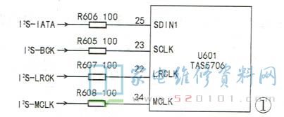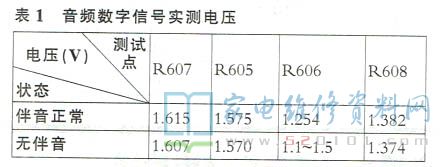 接修一台TCL L52E9FBD型液晶彩电,此机热机约半小时后无伴音,有时又会自动恢复正常,时断时续,无规律,但图像与遥控按键操作一直正常 。该机采用数字伴音功放电路,其信号输入电路如图1所示。上电测得静音控制信号MUTE(Q602的c极)电压为3.23V,正常;音频数字信号电压见表1(测试点为电阻R605~R608前端)。
