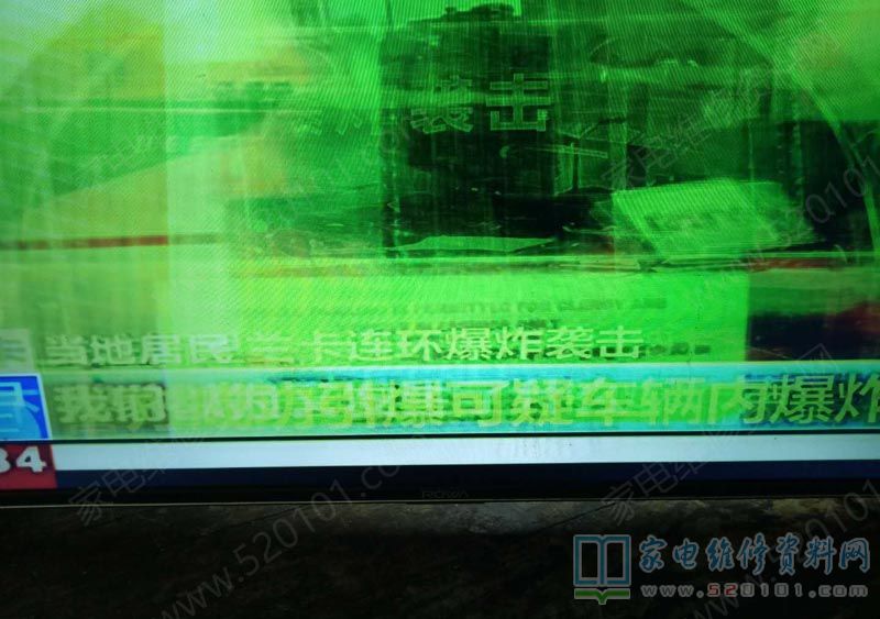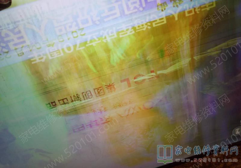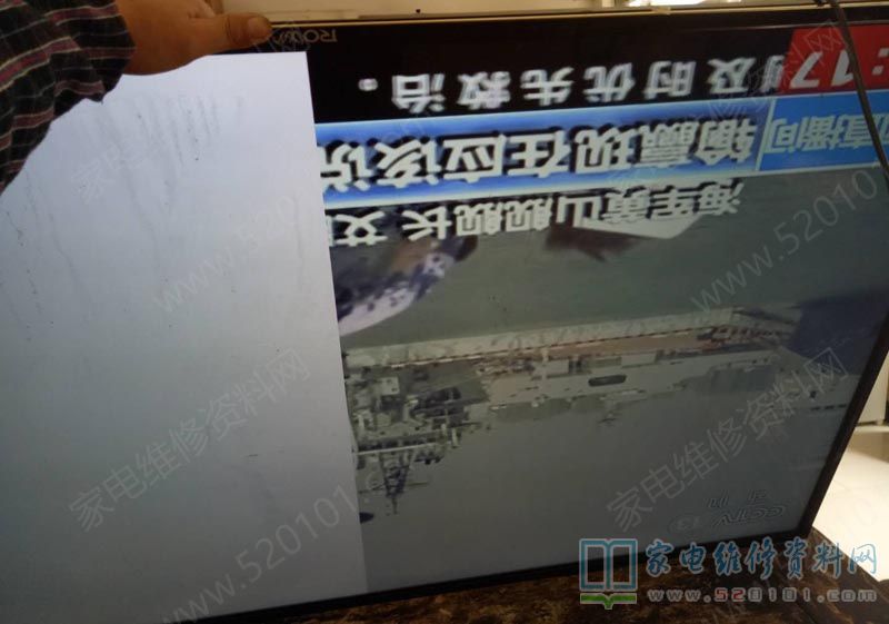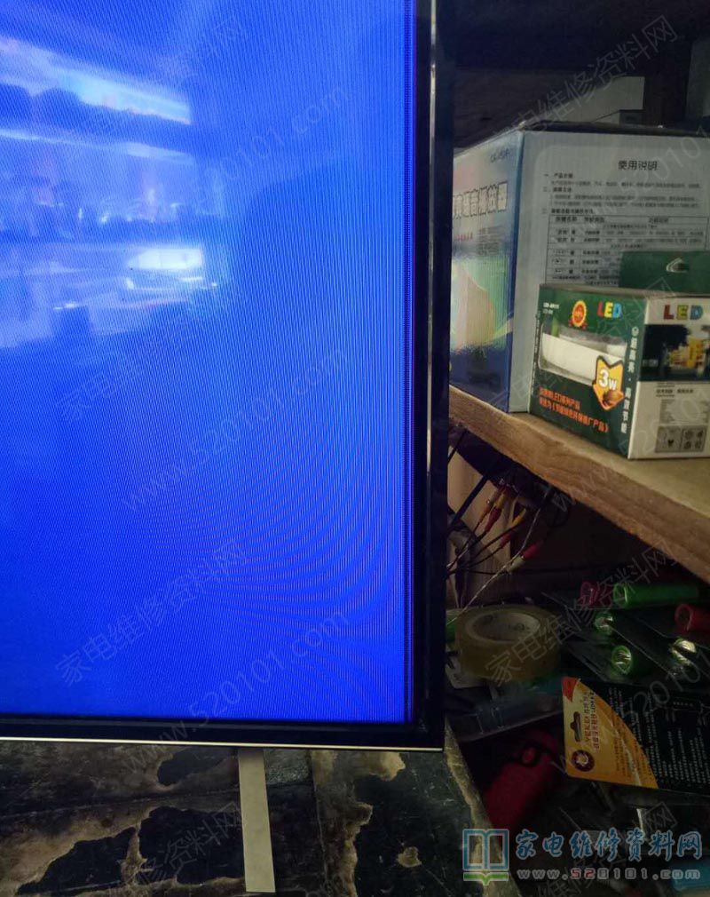 接修一台乐华55S100液晶电视,故障表现是是满屏残影,用遥控器进行换台操作后上一个台的影子还残留在屏上,色彩也不正常,并且在上电试机的时候还发现屏右下角屏内有点冒火,这也是造成不可修复的屏右边边缘2CM竖线的原因,可以肯定的是屏内部短路了。