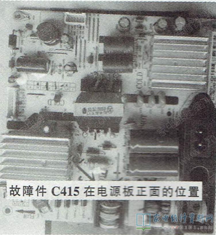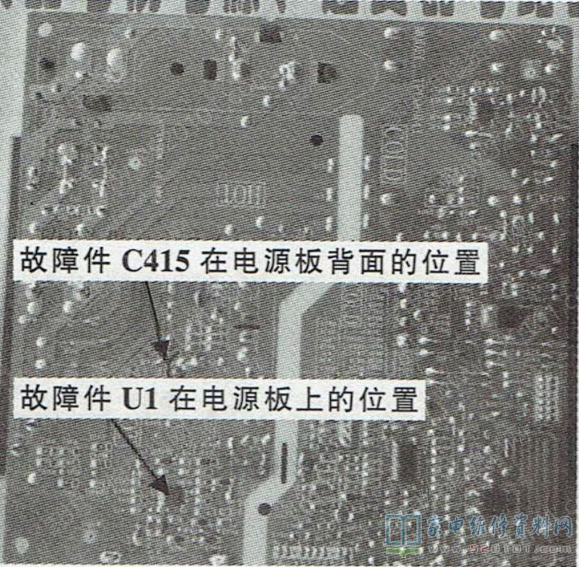 接修一台TCL D40A810型液晶电视,在观看中机内“啪”的一声响后三无。打开机壳,测量保险正常,开关管也没有击穿。拆下电源板单独维修,上电开机,测量CE1、CE2的两端电压为302V,正常;但3.3V电压为0V。测量副电源芯片u1(TEA1733 )①脚供电为7.4V,正常应为14V。断电检查,发现开关尖峰吸收电容C415( 220pF/1kV )炸裂。将其换新后上电开机,故障依旧。