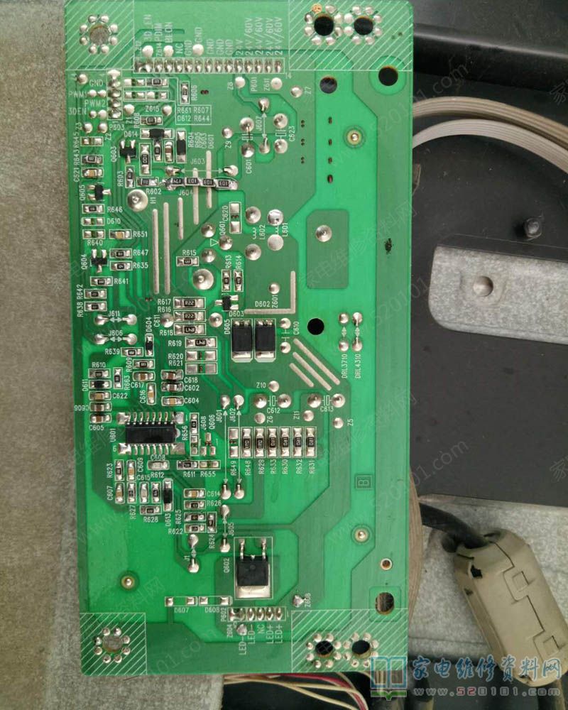 网上找了一下没有找到该高压芯片资料,正在测量芯片1脚时发现灯珠亮度有点提高,闪的频率也降低了一点,于是就突发奇想,将1脚电压升高点试试,原1脚取样电阻R602为154贴片,将其改为一个104加4个103贴片时,亮度基本稳定,但还得将阻值改小一点,于是把一个103改为512贴片,这时灯珠亮度才彻底稳定不再闪烁,拆除J604,将几个贴片安装好,拆屏换灯珠。故障彻底修复。
