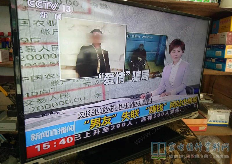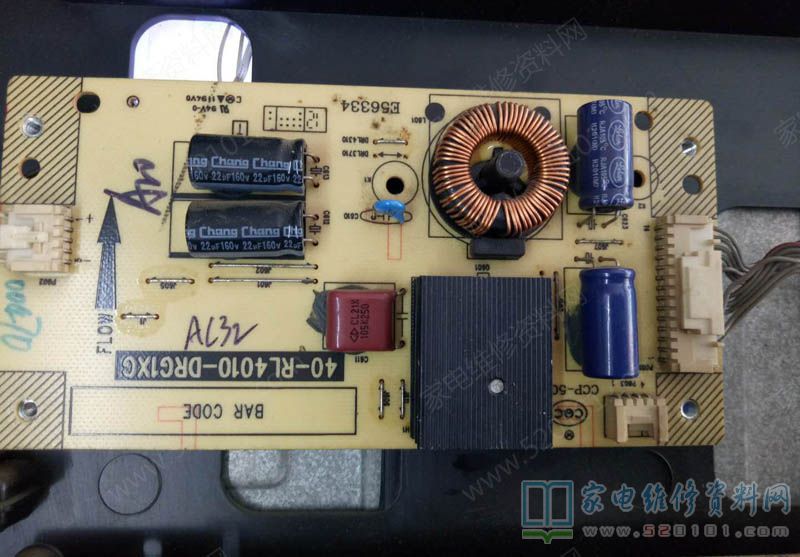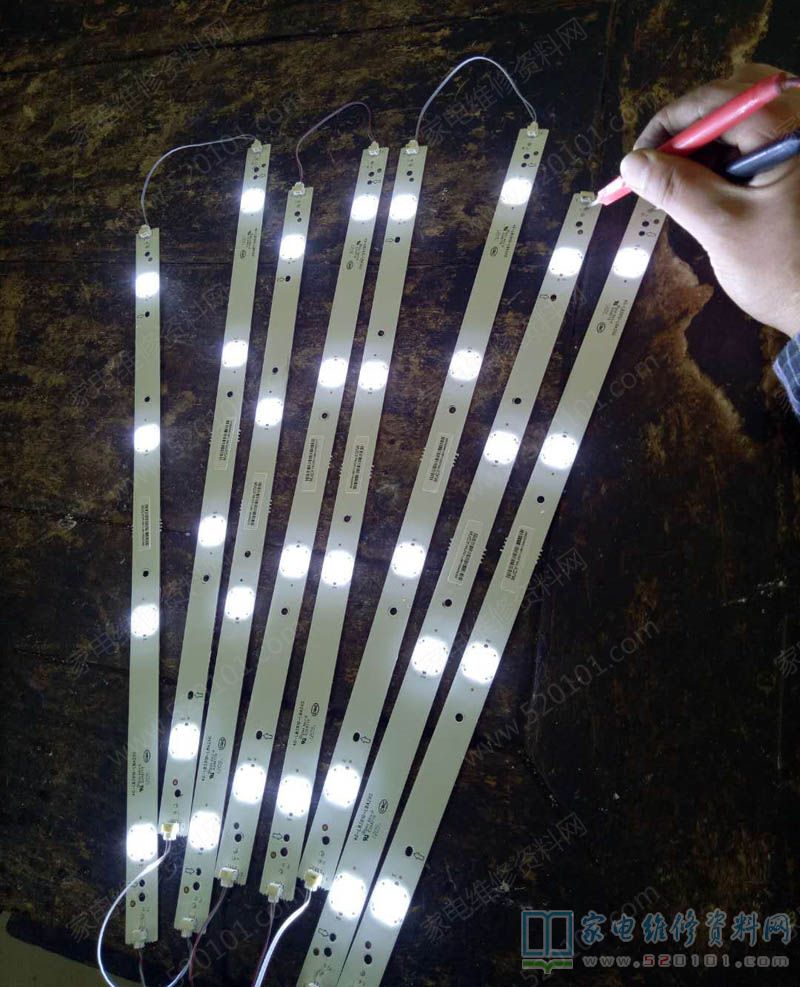 接下来搜一下此机灯条看看,8条4灯共计32颗,发现背光电压偏低不对,于是用32颗新灯珠串联外挂,开机测试,灯珠被点亮,但是一闪一闪的,测量电压只有三十多伏,高压板供电48.9V不变,这就证明高压板也有问题。