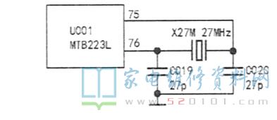 接修一台TCL L37F11型(MT23L机芯)液晶彩电,所有信号源图像均无彩色。该机芯主芯片采用MT8223L(UO01)。图像无彩色的主要原因有:(1)主程序异常;(2)27MHz主频时钟信号频率偏移或幅度不够;(3)LVDS信号传输通道有问题(LVDS信号插座、排阻、电感、过孔等存在开路或短路故障);{4)显示屏的参数不对;(5)u001内部的LVDS信号编码电路有问题。先对主程序进行升级,结果故障现象不变。检测LVDS信号插座、排阻、电感、过孔,未发现异常。接下来对27MHz晶振电路(见图1)进行检查,当手刚接触到晶振时,图像有变化,代换27MHz晶振后试机,图像恢复正常彩色,故障排除。