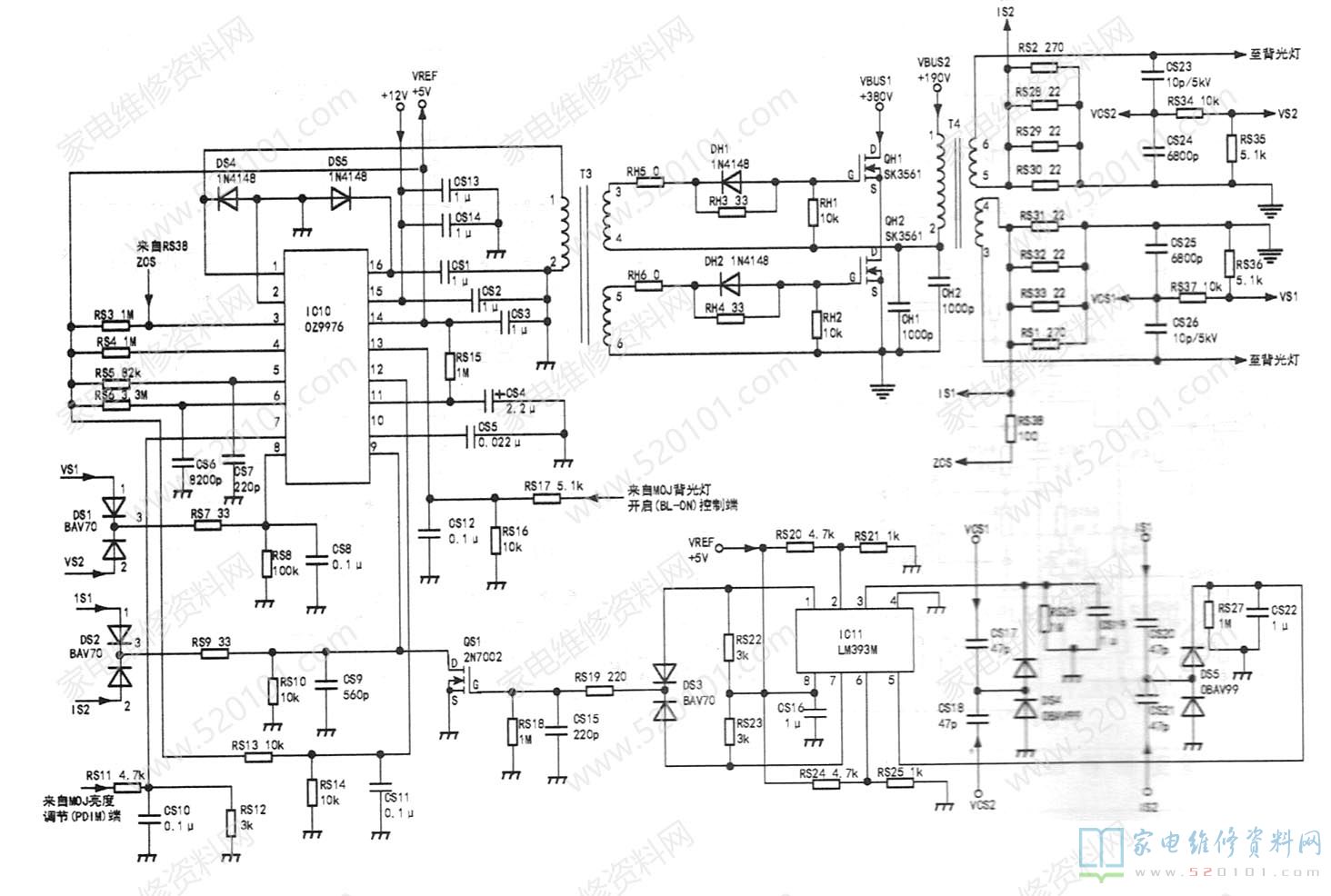 接修一台TCL L32E77液晶电视,故障表现为背光灯不亮。经查,背光板没有交流高压输出。进一步查得IC10(见图1)OZ9976的背光驱动信号输出端①、16脚无信号输出。据此分析,故障有可能是IC10周边元件损坏,也有可能是输出的背光高压过压或过流,从而引起保护电路动作所致。查IC10电源电压(+12V)正常。为保险起见,先断开交流高压回路,然后再断开IC10过压保护端试机,刚听到高压变压器T4的磁芯对线包有放电“咝"声,随即消失。看来,故障极可能是高压变压器打火,引起过流保护电路动作。从背光板上焊下T4,用无水乙醇仔细清洗后再用吹风机烘干,最后用704硅胶将整个变压器密封,待干透后复原试机,故障消失。