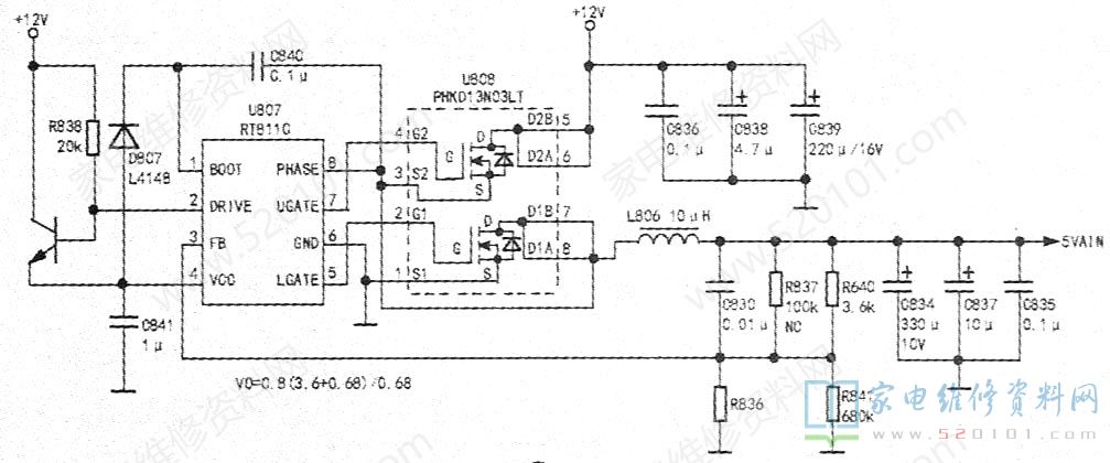 接修一台TCL L42E9FBD型液晶彩电(MS68机芯),机主称:多次开机可正常,这时关机后立刻开机仍正常,但关机时间稍长就不能开机了。查询资料得知,MS68机芯彩电有冷机不开机的故障通病,其原因是D100不良,拆下D100即可排除故障。按此法处理后试机,故障依旧。上电开机,测量主板上各DC-DC电路的输入、输出电压,发现U805( AIC1084 )的③脚电压波动,在冷机开机瞬间,此脚电压在2.2V~3.8V间波动,最后稳定为4.189V,此时不开机。正常开机后,此脚电压稳定为3.865V,U805的③脚输入电压5V-DDR2来自5VAIN,而5VAIN来自+12V,其DC-DC变换电路如图1所示。