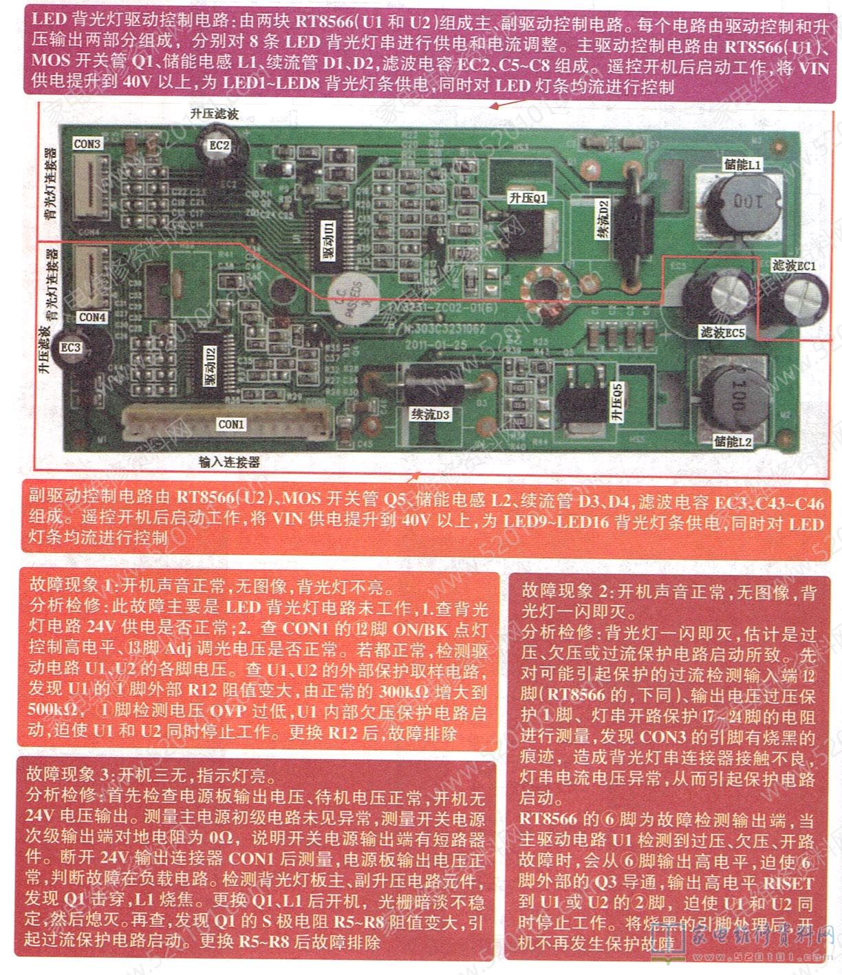 TV3231ZC0201(B)背光板编号为303C3231062,其实物如图1所示。该背光板应用于TCL LE32C16、熊猫LE32MI9、乐华LED32C100、LED32C500等机型液晶彩电中。该板驱动控制电路采用两块RT8566组成主、副两个驱动电路为16条LED背光灯串供电,并进行均流控制和调整。