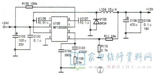 12V电压是由24V电压经DC/DC变换块U100(MP1593DN)转换得到,如图7所示。待机指示灯与屏供电控制电路所需的5V电压,由DC/DC变换块U101 (RT8110B) 与Q100(D13NO3LT)将12V电压变换得到,决定从12V电压查起。上电测得C109正极电压为0V。观察发现,滤波电感L104一端已脱焊,重新焊接后试机,故障排除。
