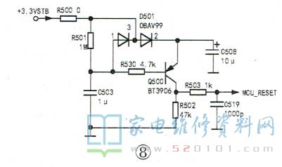 例2:一台LED37C720L型液晶彩电,上电后指示灯亮,按遥控“开机”键后待机指示灯不熄灭,也不开机。分析检修:测主板上插座P100 10脚无+3V的高电平开机信号,U501的开/待机端214脚也未输出高电平开机信号。查U501相关端子供电情况,未发现异常。如果CPU外接的时钟或复位电路异常,也会导致不开机。先查U501②脚外接的复位电路,如图8所示,发现始终没有高电平信号输出。正常时,在开机瞬间,Q500的c极输出高电平,随后Q500截止,其c极输出低电平,复位结束。经查Q500的c、e极已开路,将其换新后故障排除。