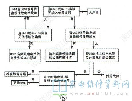 故障现象2:无声音。分析检修:如果只是某一信号源无声,则先检查该信号源的输入电路;如果所有信号源均无声音,其检修流程如图5所示。