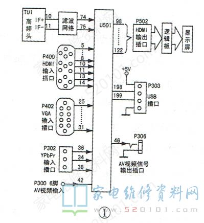 HDMI信号经插口P400从U501的⑤~⑧脚及10、11、13、14脚输入;VGA信号经插口P402从U501的25~31脚输入;YPbPr信号分别经插口P302从U501的36、34、38脚输入;AV视频信号经插口P300的⑥脚送到U501的42脚;AV视频信号从U501的46脚送至插口P306对外输出;USB插口P303的数据端与U501的198、199脚相连。模拟信号在U501内先经AD转换,变为数字信号后再送入信号选择开关,与输入的数字信号进行切换,后续处理同TV信号。