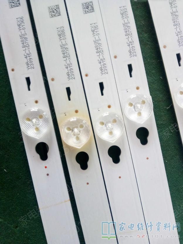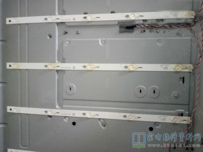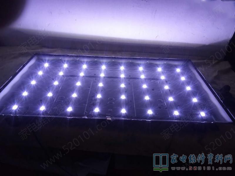 拆机测量背光闪时,电源12V稳定,背光开启3.3v也稳定。就是闪的时候灯条电压从59V下降到50V,此恒流板与电源板是一体的。由于机子没信源输入时不会闪,加上机子买了不到四年,估计灯条还好,于是换了块电源板,现实让我不开心,故障一样。看来还是开开更清楚。八条灯,有一条颜色发黄。全套更换,装机后试机一天故障不再出现。