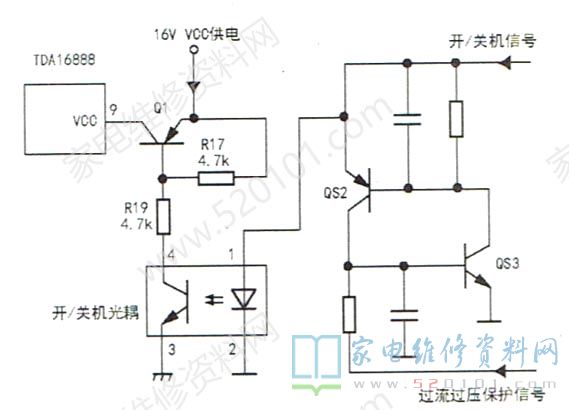 在正常工作时,测芯片⑨脚vcC电压,发现仅10V,且有波动。此电压受Q1开/关机信号控制,当光耦收到开机指令后导通,R19给Q1提供基极电流,则+16V电压经Q1的e、b极及R19、光耦到地,如果光耦完全导通,流过Q1的e、b极的电流约有3mA,Q1应处于饱和导通状态,管压降仅0.2V左右。在故障发生时,测Q1的e极电压为16V,正常,但芯片⑨脚vCC电压仅8V左右,即Q1的c、e极间有6V以上的压降,这显然不正常。分析其原因,主要有以下3种:一是光耦未充分导通,二是Q1变质,三是R19变值。在路检测发现R19阻值大于标示值的4.7kΩ,拆下测量其阻值在15k2~50k2之间变化,由此引起Q1基极电流不稳定,使TDA16888的⑨脚vcC电压偏低且不稳定,如果vcC电压过低,则主电源就停止工作,这时负载电流减小vcC电压会回升,加上R19的不稳定,如果vCC升到芯片的启动电压,主电源又会自动启动。更新R19后故障排除。