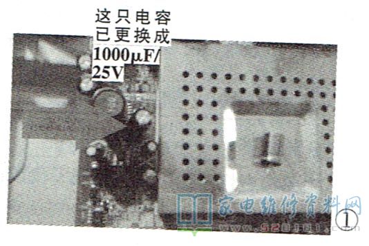 接修一台TCL 55英寸液晶电视,上电后面板商标指示灯"TCL"亮,整机无反应。测得CPU供电为3.2V,正常;二次开机后,24V电压正常,PFC电压为390V,说明整机已处于开机状态,但背光不亮,也无开机音乐声,说明主板工作异常。二次开机后主电源输出24V电压送给主板,先经DC-DC电路转换成12V,再经DC-DC输出5V,为各路稳压器供电。测量12V电压正常,但12V转5V输出的电压不稳定,在5.8V~6V之间波动,随着电压的波动,逻辑板发出“吱吱”的声音,估计是逻辑板上面的DC-DC转换电路工作不稳定发出的噪音。检查12V转5V电路,发现5V滤波电容( 330pF/25V)有鼓包现象,如图1所示,将其换新后输出电压降到5.3V且稳定,同时,背光点亮,整机正常工作。后测量这只电容,实际容量只有56uF。