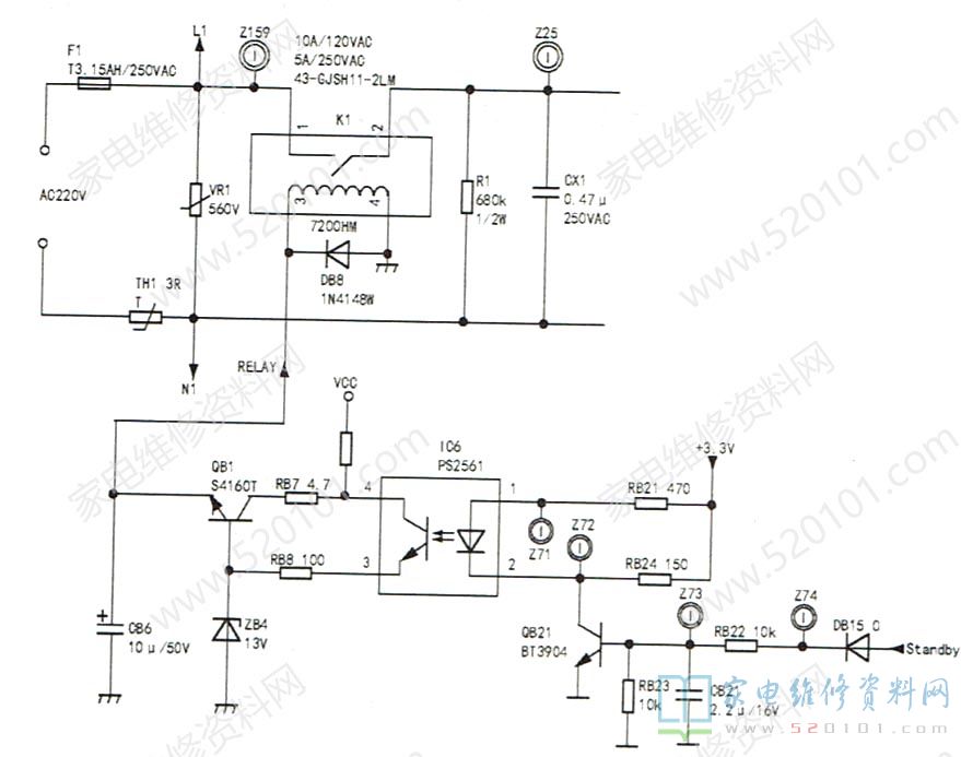 既然开机瞬间P_ON端有3.3V的高电平出现,U501坏的可能性不大,问题是否出在电源板上呢?接通电源开关,测电源板P2插座各脚电压,发现①、②、④脚竟然有24.1V电压,感觉不对,因为该电压受控于P_ ON信号,如图1所示,即只有在二次开机后才会输出。测得IC6的①.②脚无压差,③.④脚电压分别为13.6V和0V,QB1的e极电压为0V,这说明电路处于正常的待机状态。至此故障范围缩小到继电器。经查该继电器的①、②脚短路。继电器型号为GJ-SH-112LM。因找不到同型号继电器,决定用电压力锅用的MPA-S-112A型继电器代换。接好引脚后开机,红灯亮,P2的①、②、④脚电压均为0V;二次开机后,指示灯闪烁几下,图像、声音均正常。
