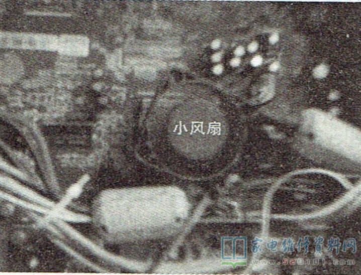 在多次检查中发现一个现象:只要是开盖检查,开机1个多小时,电视机仍在正常工作,但合盖试机,故障在1小时内就会出现。据此,推测电视机内某个部件热稳定性不好。合上后盖不装螺丝通电让电视机工作,待故障出现后迅速断电并把后盖掀起,直接用手摸怀疑的器件。当摸到主芯片的散热板时,感觉烫手。先试试降温再说,找来一只电脑CPU用的12V小风扇,接上主板的12V电源,用扎线把风扇固定在主IC的散热片上,如图1所示。开机,小风扇运转给主芯片散热,合盖连续试机4小时,故障末出现。