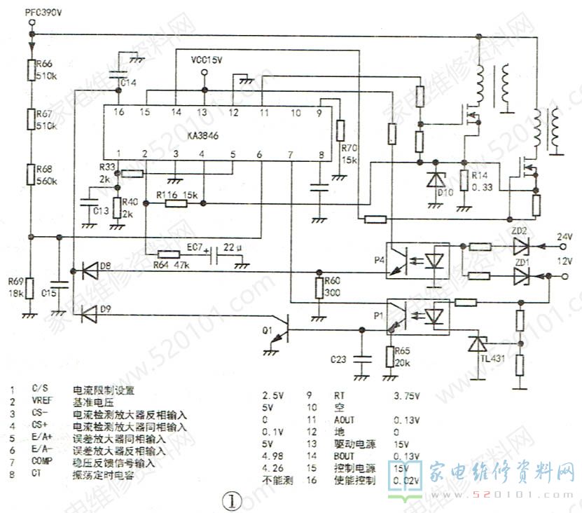 按以上思路检查发现主板POW-ON/开关机控制信号和PFC滤波电容上的390V电压正常,监测主电源24V输出,在遥控开机时有一个很低的(约1V)电压一闪而过马上降为0V,说明主电源有问题。该机主电源芯片是KA3846,按实物画出有关线路如图1所示,引起本芯片工作一下马上停止工作的原因有:一是过流引起芯片④脚电压升高大于0.5V;一是13和15脚电源供电不正常;三是16脚电压大于0.35V。另外芯片6脚是检测PFC电压是否正常,现在PFC电压390V正常,而且如果由于某种,原因引起⑥脚电压不正常芯片根本就不会工作,开机时次级不会有1V输出,所以⑥脚原因可以排除。