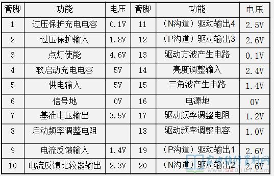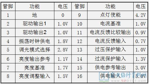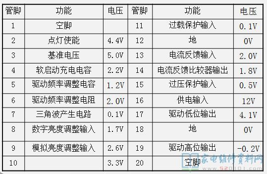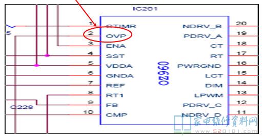 该脚为输出电压过压保护输入。当灯管开路、接触不良或损坏时输出电压就会升高,通过取样电路反馈到该脚,该脚电压也会升高,当升高到一定值时,就会启动IC内部保护电路,IC停止工作。