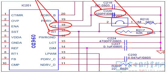 有的IC多设计一个RT1脚,该脚外接一个电阻到RT脚。在电源启动时RT1在IC内部被连接到地,相当于给RT脚并联一个电阻,使得RT电阻减小,从而使启动时的驱动频率更高,以便获得更高的启动电压。