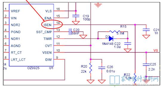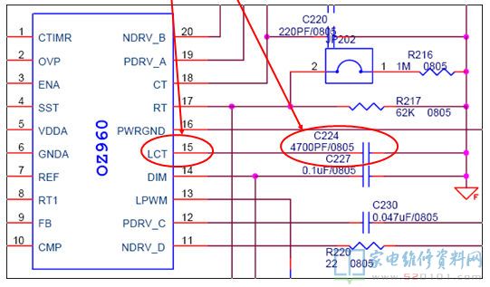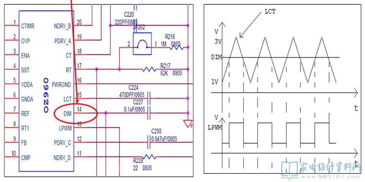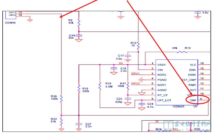 该脚为从数字板过来的一个模拟直流控制电压,LCT脚产生的三角波与DIM脚电位进行比较,产生需要的方波。改变DIM电压,可以改变方波的占空比,从而改变MOS管的导通状况,最终改变灯管的亮度。