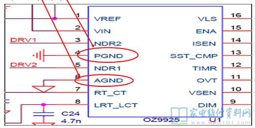 为了减小灯管与输入供电电路之间的干扰,有的背光板上设计了两个地,即信号地和电源地。信号地与灯管部分地相连,电源地与MOS管导通电路的地相连。信号地与电源地在背光板输入电路部分直接相连或通过跳线线相连。