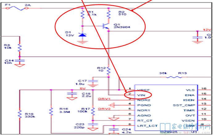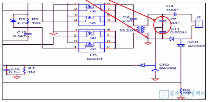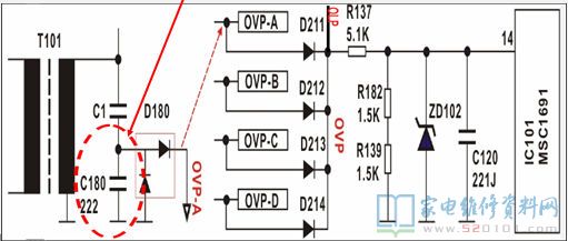 原因分析:过压保护下取样电容选用的是负温度系数较大的电容,开机后随着机内温度的升高,下取样电容的容量减小,阻抗增大,分压升高,这样取样反馈电压较高,造成过压保护。