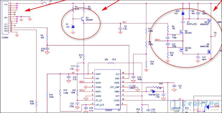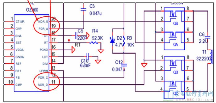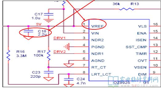 该脚为IC的驱动脉冲输出,有的IC有四个驱动脚输出,分别为PDRA、NDRB、PDRC、NDRD, 前两个脚与后两个脚轮换着产生高电平和低电平,分别控制着四个MOS管的导通与截止;有的IC只有两个驱动脚输出,分别为DRV1、DRV2或HOUT、LOUT或AOUT、BOUT,这两个脚轮换着产生高电平和低电平,每个脚控制2个MOS管的导通与截止。