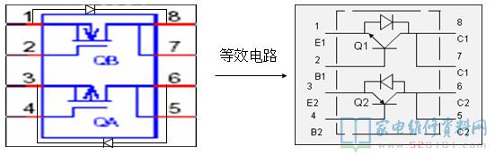 下图为FDS8958A内部电路图,右图为其等效电路图。用万用表单独测量MOS管电路时,5、6脚是相通的,7、8脚是相通的,1、8脚之间及3、6脚之间因有反向保护二极管,因此正向有几K欧姆阻值,其它引脚之间阻值均为无穷大。在板上因为有外围电路影响,测量时各脚之间会有不同的阻值,但除5、6、7、8脚外其它脚之间不应该短路,若出现短路情况则为MOS管损坏。