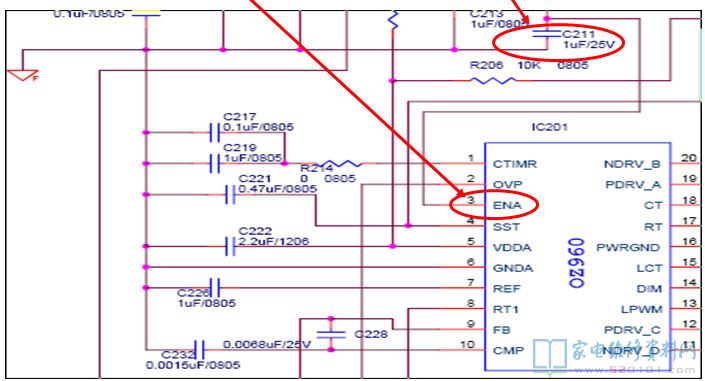 一种典型电路是数字板过来的ENA信号经过电阻、电容电路后直接加到PWM控制IC的ENA脚,如下图: