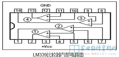 一般用于电流取样比较,其内部电路如下图,3脚为VCC,12脚为地,4脚、6脚、8脚和10脚为四个电压比较器的反向输入端,5脚、7脚、9脚和11脚为四个比较器的正向输入端, 1脚、2脚、13脚和14脚为四个电压比较器的输出端。