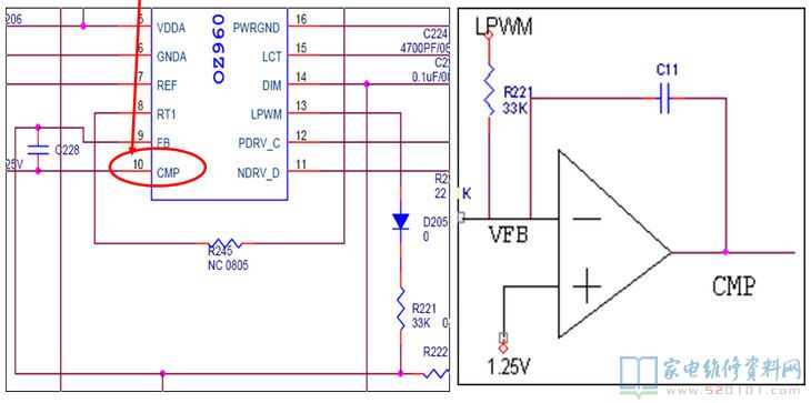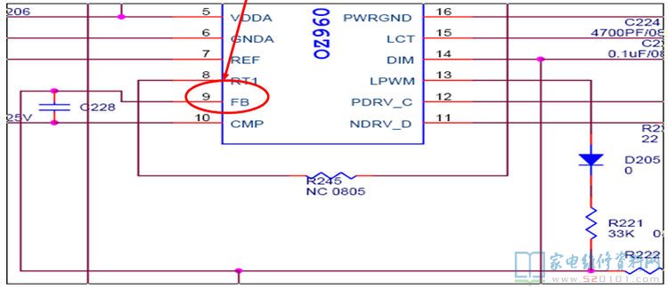 该脚为IC内部电流反馈比较器输出端,当灯管出现开路或损坏时,灯管没有电流,FB电位急剧下降,CMP输出高电平,将IC关闭,电源进入保护。
