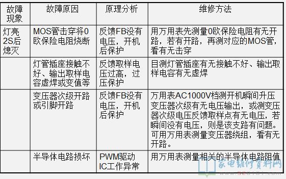 升压变压器初级绕组阻值为0.5欧姆左右(X1欧档),两个绕组串起来阻值为1欧姆左右(有些机器设计时直接将两个初级绕组串起来,初级绕组的另一端悬空)。升压变压器次级绕组阻值约在500-1000欧姆之间(X100欧档)。若出现开机2S后保护时,可对比测量各升压变压器的绕组阻值,将绕组阻值异常的变压器更换(不同型号变压器管脚排列一样,参数略有差异,有的可直接代用,有的代用后灯管亮度有区别。)
