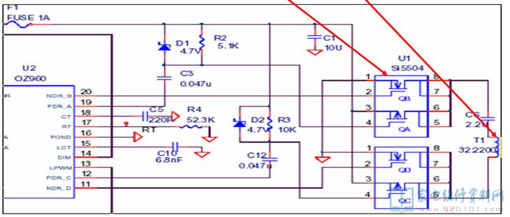 升压变压器T1的初级在MOS管不断的导通与截止下获得高频方波,再通过变压器耦合在T1的次级感应到电压值更高的高频方波电压,该电压通过变压器漏电感及回路电容组成的LC谐振电路。当方波从低电平跳到高电平时,由于漏电感有抑制作用,使输出波形慢慢升到最大;当方波从高电平跳到低电平时,由于漏电感有抑制作用,使输出波形慢慢降到最小,如此将方波变成正弦波,加到灯管上。这是一个有效值为800V左右的交流电压,在开机瞬间该电压能达到1500V左右。