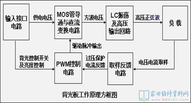 背光板电路由输入接口电路、PWM控制电路、MOS管导通与直流变换电路、LC振荡及高压输出回路、取样反馈电路等几部分组成,其工作原理方框图如下: