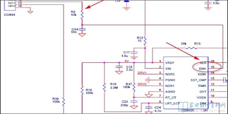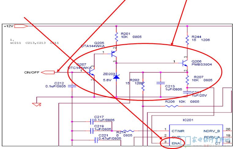 另一种典型电路是数字板过来的ENA信号通过三极管、稳压管控制电路,将电源板过来的供电电压进行降压、稳压,产生ENA电压,加到PWM控制IC的ENA脚,如下图: