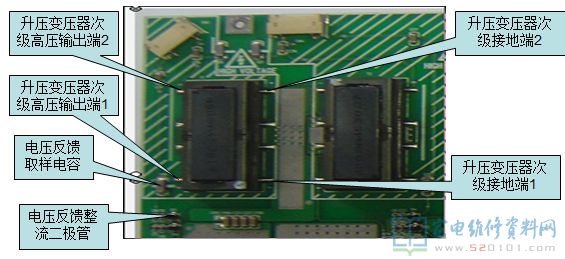 灯管插座的每一端与升压变压器的一个次级高压输出端相连,该脚所连的电容(贴片或瓷片)即为过压保护取样电容,电容的另一端接一个整流二极管,二极管正端的电压即为电压反馈取样电压。有的电路在升压变压器的次级接地端会接一个二极管,则该二极管即为电流取样二极管。