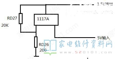 接修一台TCL D32E167液晶电视,故障表现为三无,指示灯不亮,测12V正常,5V正常、3.3V正常、1.25V正常、1.5V为0,走线路查得1.5V为UD2稳压输出而来,测该IC输入端5.0V,输出为0V,该三端为1117A输出值未标注。手头上只有1117A-1.2,更换后,输出为1.9V偏高。画出该IC外围可知,RD26决定了输出,于是将RD26减小到100欧,测得输出为1.48V,基本可以,恢复电路通电故障排除。