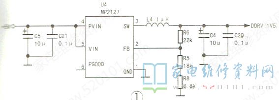接修一台TCL L42E5600AN-3D型液晶电视(MT55机芯),开机后不久屏上出现杂乱无章的间断竖线,然后变为灰屏,但声音一直正常。首先怀疑软件有问题,但软件升级后故障依旧。考虑到图像信号的数据处理主要由两只DDR3存储器(K4B2G1646C) 与主芯片UM1(MT5505)完成,决定先查DDR3的+1.5V供电,发现该电压在0.6V~1.2V之间波动,这显然不正常。该电压由+5V_1电压经DC-DC转换块U4( MP2127)转换而来,如图1所示。