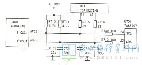 如果上述初始化过程异常,则终止该程序运行,U400的开机端(H5不会发出高电平开机指令。开机后测量U400的时钟振荡AG1、AH2端波形正常,复位G1端(高电平复位)复位电压也正常,但I2C总线时钟端AF22的电压为0V(正常应为3.3V),U400外挂总线器件有高频头UT1 (TDA18273HN)和音频数字功放U701(TAS5707),如图1所示。