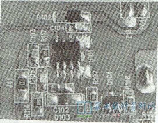 接修一台TCL39F1600E型液晶电视,雷击后三无。拆机发现电源二合一板(板号40-EL3916-PWEIXG)上电源集成块U101( 6754)炸裂,如图1所示。测量保险F1(3.15A/250V)、整流二极管BD1~BD4 (RL255)、 开关管QW1(10N65)均正常,二极管D104已击穿,其他未见异常。将上述损坏元件全部换新后通电测试,12V输出电压只有2V,且波动;3.3V电压为0V。