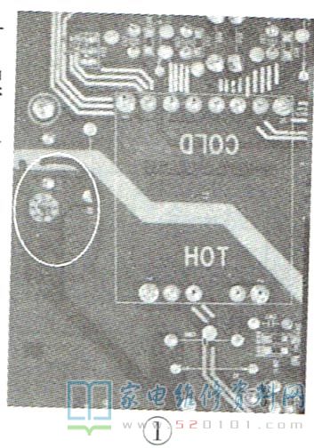 仔细观察,发现电源板热端的一片散热片缺-颗螺丝,如图1所示。