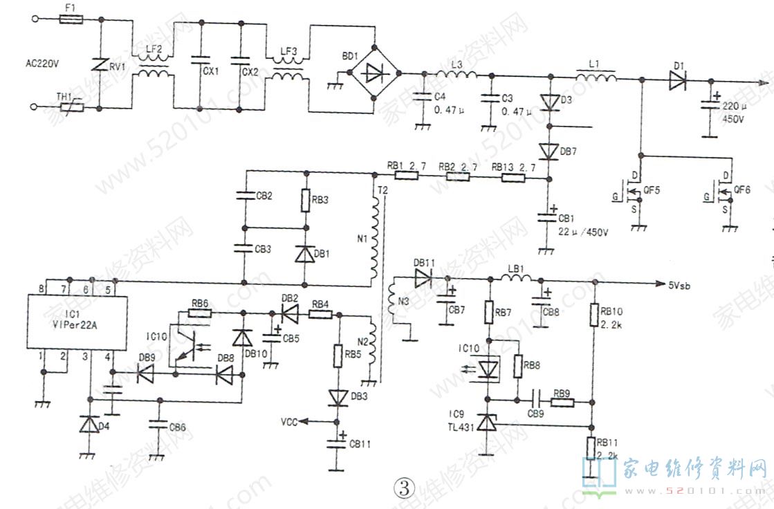 于是找一只带垫片且粗细合适的螺丝拧上,让散热片与地接触良好,试机一个小时故障未出现。令人不解的是:.上述散热片上只有PFC整流二极管D2和PFC开关QF5、QF6三只元件,并且该散热片离副电源较远,难道故障另有原因?决定检查副电源。该机副电源电路如图3所示。