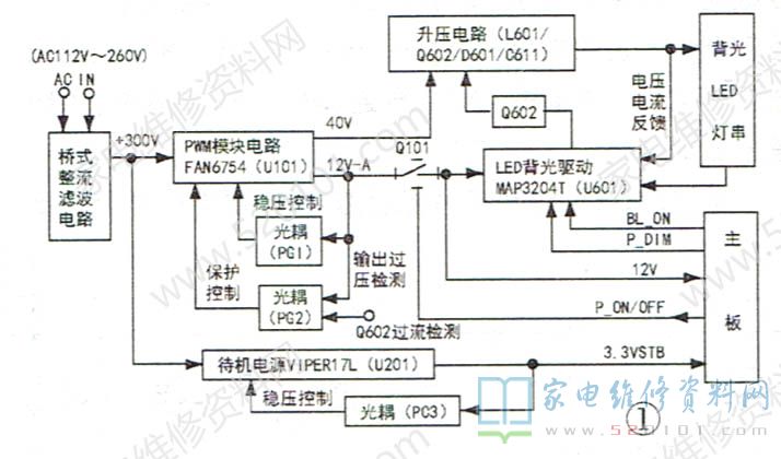故障现象3:电源带负载能力下降。分析检修:该故障的具体表现:在负载变化时(比如声音变大、亮度变大),输出电压12V/40V明显下降并波动,甚至引起过流保护电路动作,导致黑屏。检修这类故障应先查市电VA(300V)电压是否正常,若不正常则对市电整流滤波电路进行检查;若VA正常,则表明PWM电路存在故障,如QW1饱和压降过大、滤波电容C107~C109/C113、C114失容、整流管DS1/DS2内阻变大等。