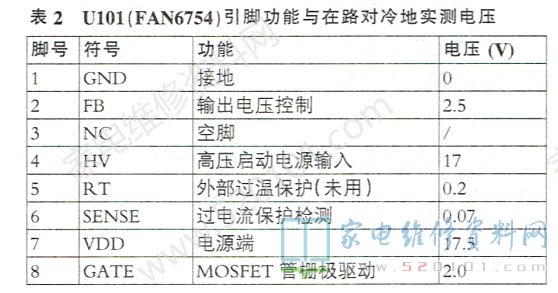 故障现象2:无12V电压输出。分析检修:先测控制管Q101的S极电压是否正常。若正常,则检查开/待机电路。否则,说明电源本身不能工作或因保护电路动作,这时可断开L102(参见图2),在40V输出端对地接-一个电压表试机,如果电压明显高于12V,表明故障极可能是过压保护电路动作所致,应检查稳压环路。若电压表读数基本正常,则说明过流或保护电路损坏,需对负载作“断开法”排除。假若电压表读数为零,可断开R115后再试机,若电压不为0V,则说明PC2次级或D113已击穿;若电压表仍为OV,则表明PC1次级(含D102、C104)之中可能存在短路故障。若对上述元件检测未发现异常,在U101电源端⑦脚启动电压不低于17V的前提下,可代换U101试之。U101引脚功能及参考电压见表2。